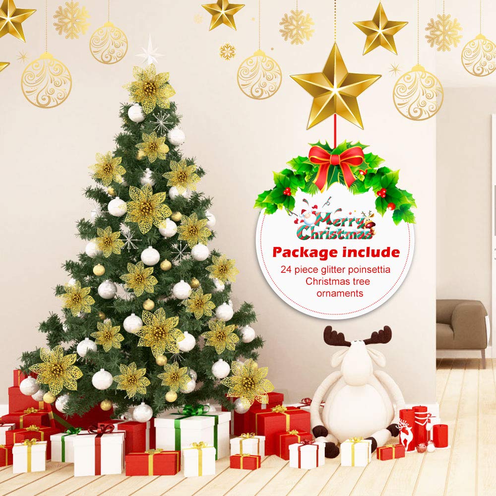 Oro DECARETA 24 Pezzi Fiori per Albero di Natale Artificiale Glitter Fiore 14cm/10cm/8cm Ornamenti per Albero di Natale Glitter Fiore Artificiale Oro per la Decorazione dellalbero di Natale