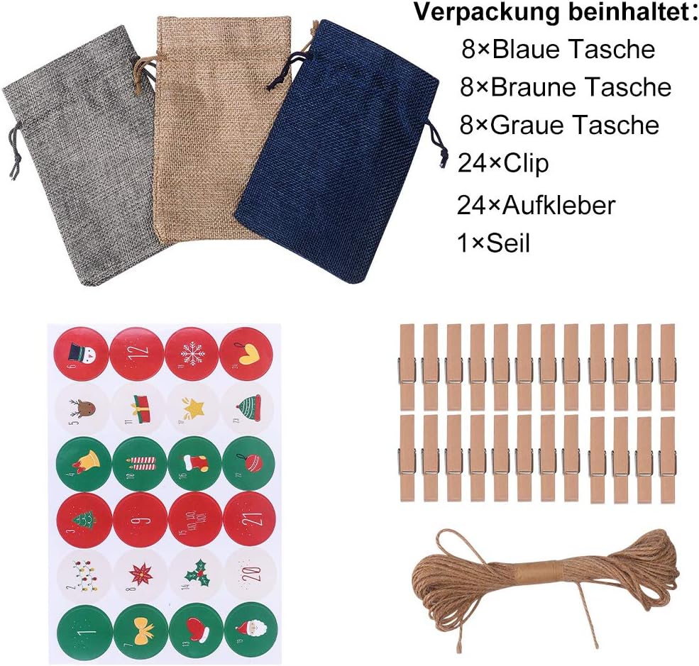CGBOOM Borsa di Tela di Lino con Coulisse 24 pezzi 24 Mollette per la Decorazione Calendario dellAvvento 2020 Borsa Regalo di Natale Piena di 1-24 Adesivi Digitali Cavo di Tela