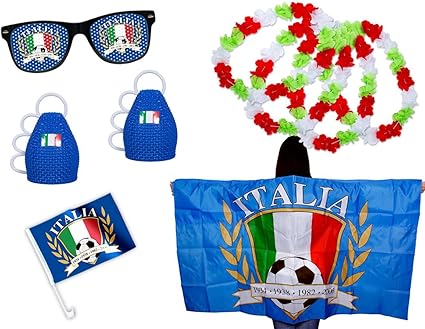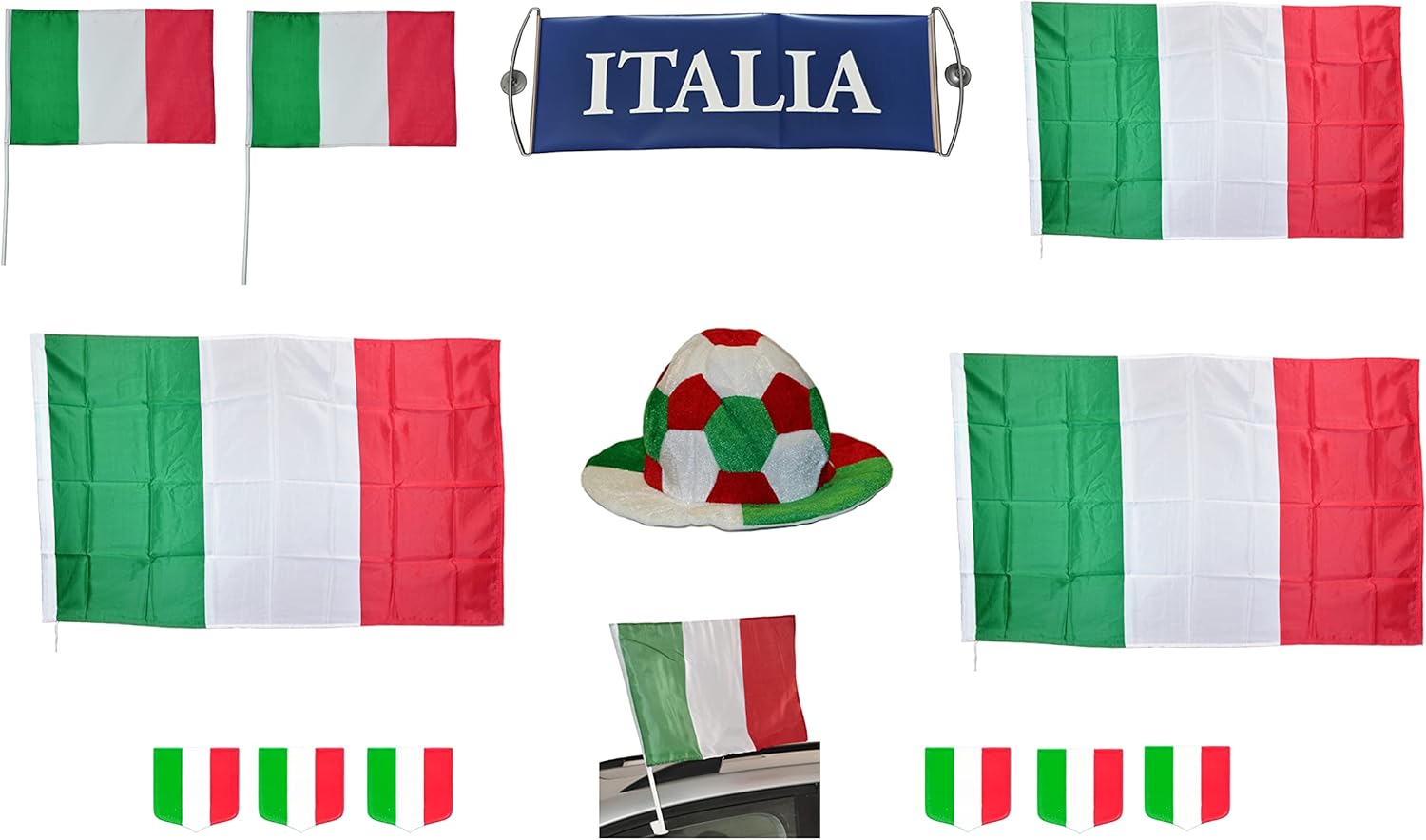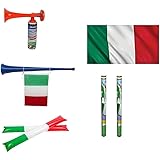 Zeus Party Kit Tifoso Italia Trombetta da Stadio 47cm con Bandierina 2 Palloni Gonfiabili Battola Girevole Rumorosa