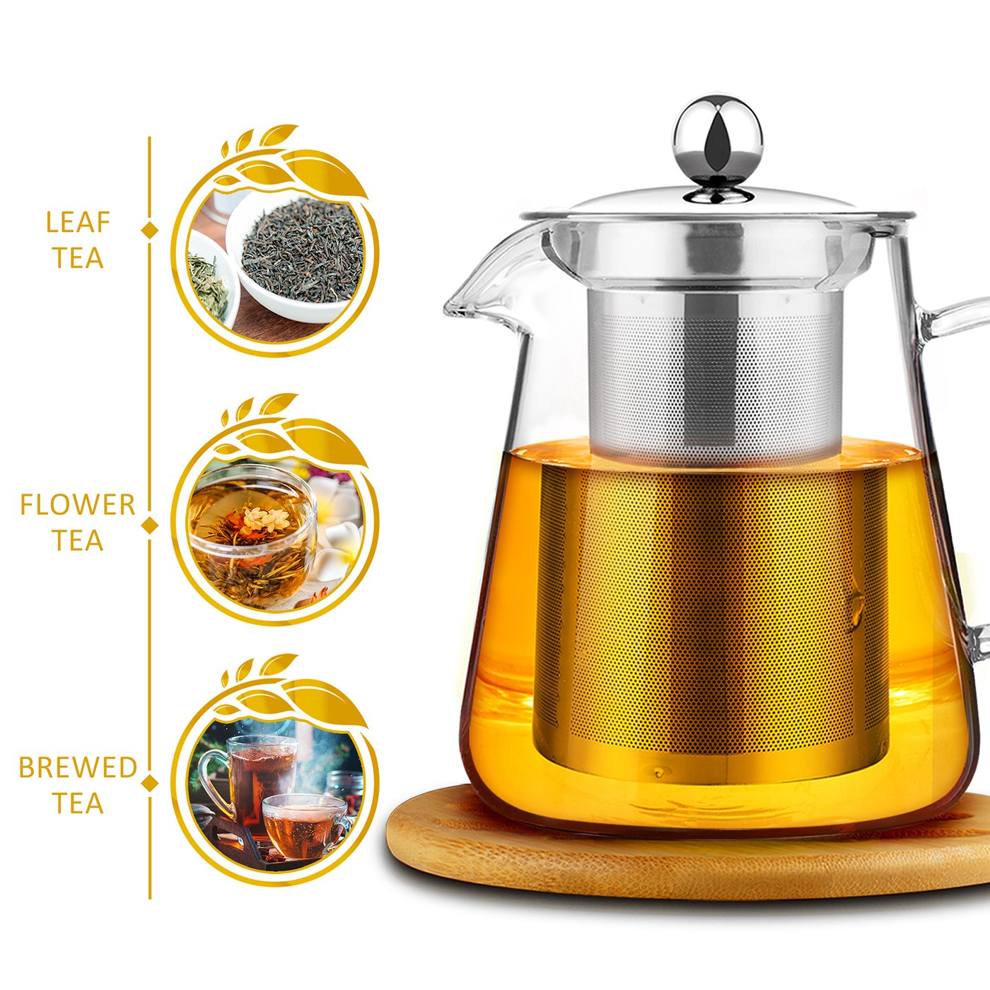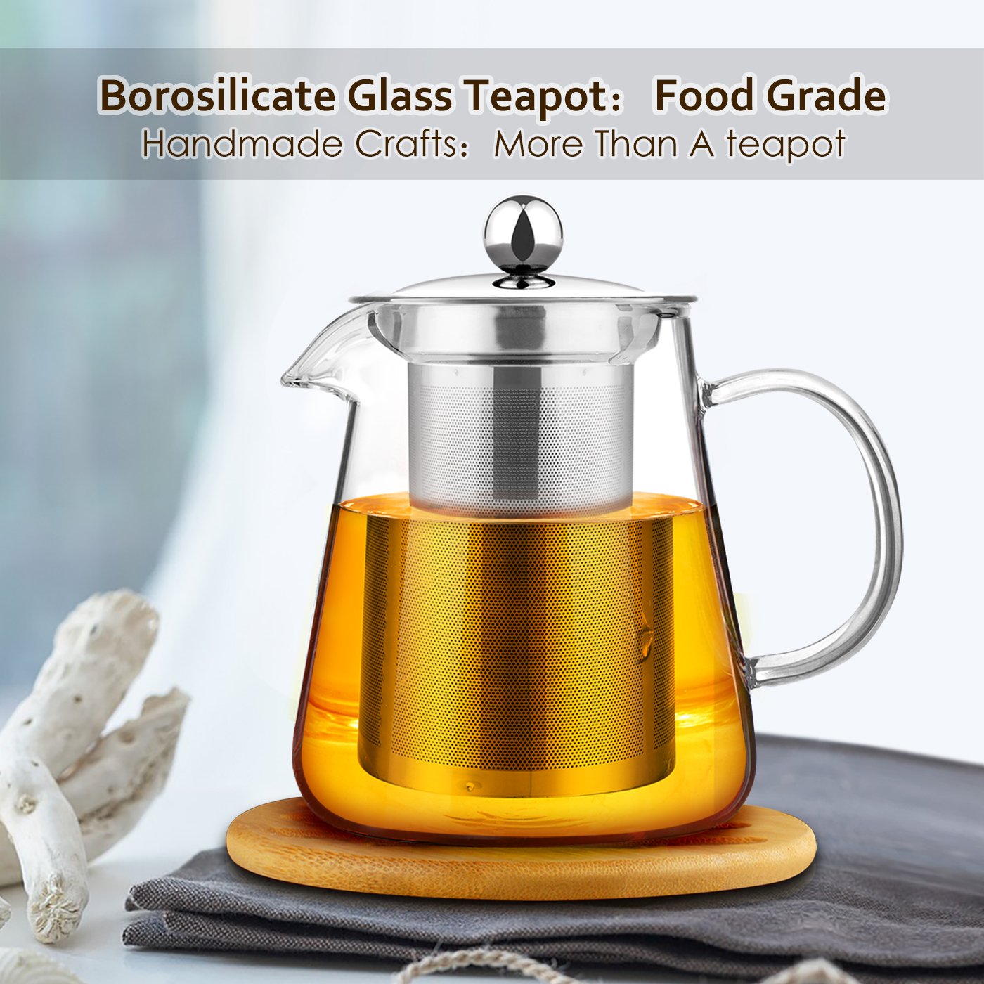 include sottobicchiere in legno AckMond Teiera in vetro borosilicato trasparente con filtro e coperchio in acciaio inox 900 ml